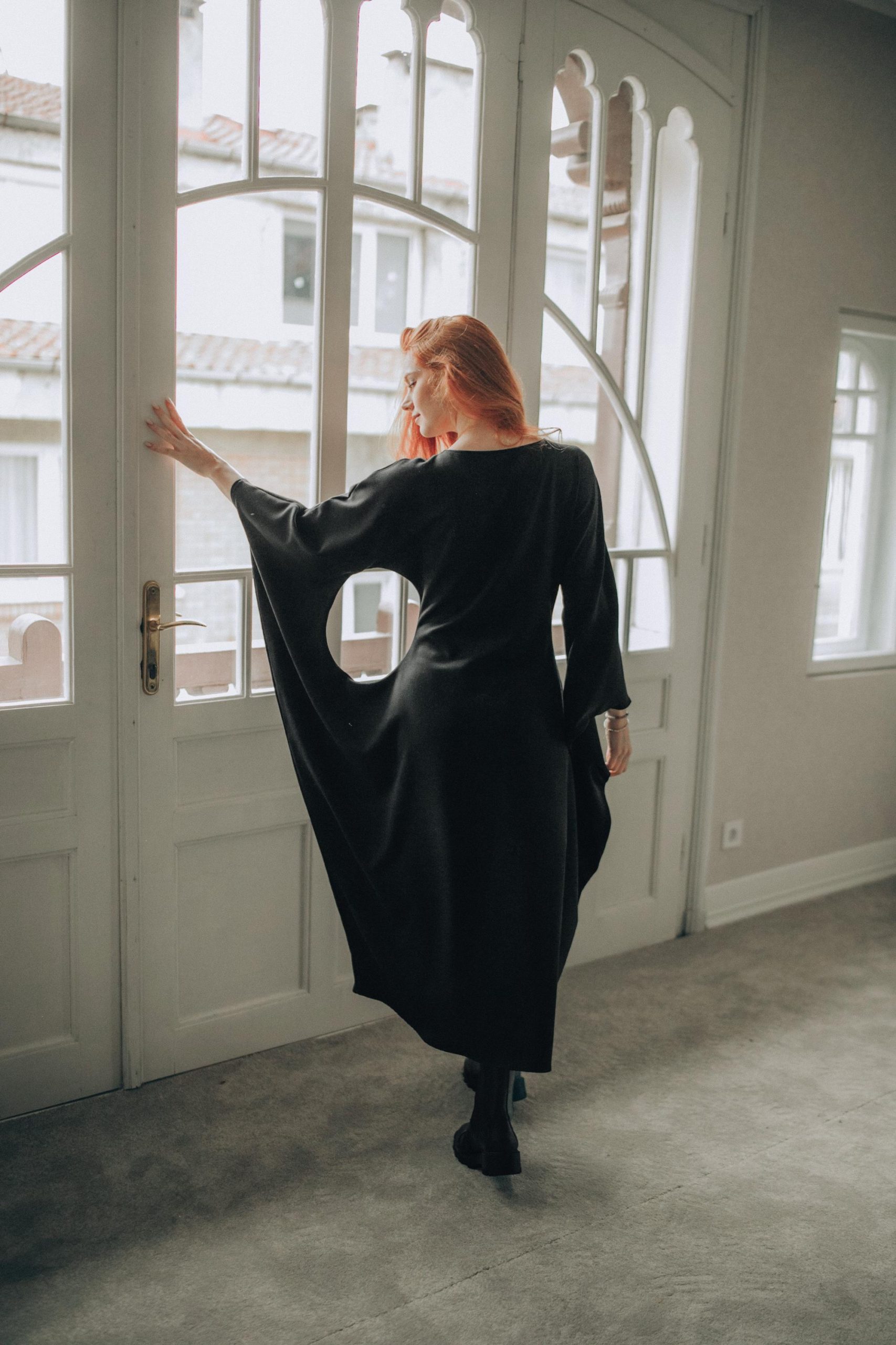 Elevate your everyday elegance with this cotton midi dress, designed for women who love comfort with a touch of drama. Crafted from soft cotton blend fabric, the dress features a flowing draped silhouette that flatters every shape and moves beautifully with you. The batwing sleeves create a sense of effortless grace, while the subtle side cutouts add a modern, refined edge.