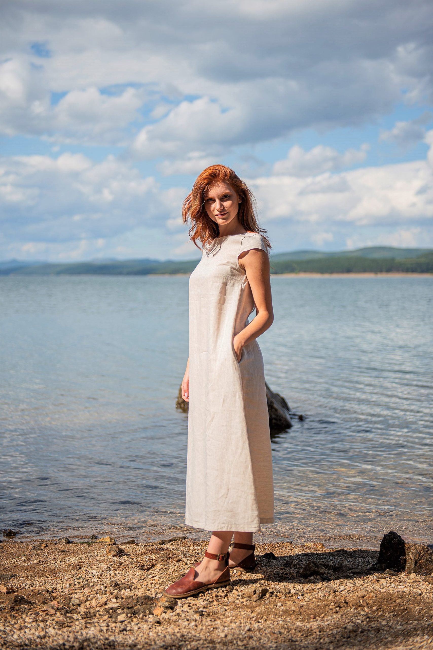 Designed entirely in pure linen, this midi length A-line dress brings you the timeless style you will wear for many summers to come. А minimalist piece that has cap sleeves, sleek knee length silhouette and hem pockets. Perfect for a comfy and breezy day look.