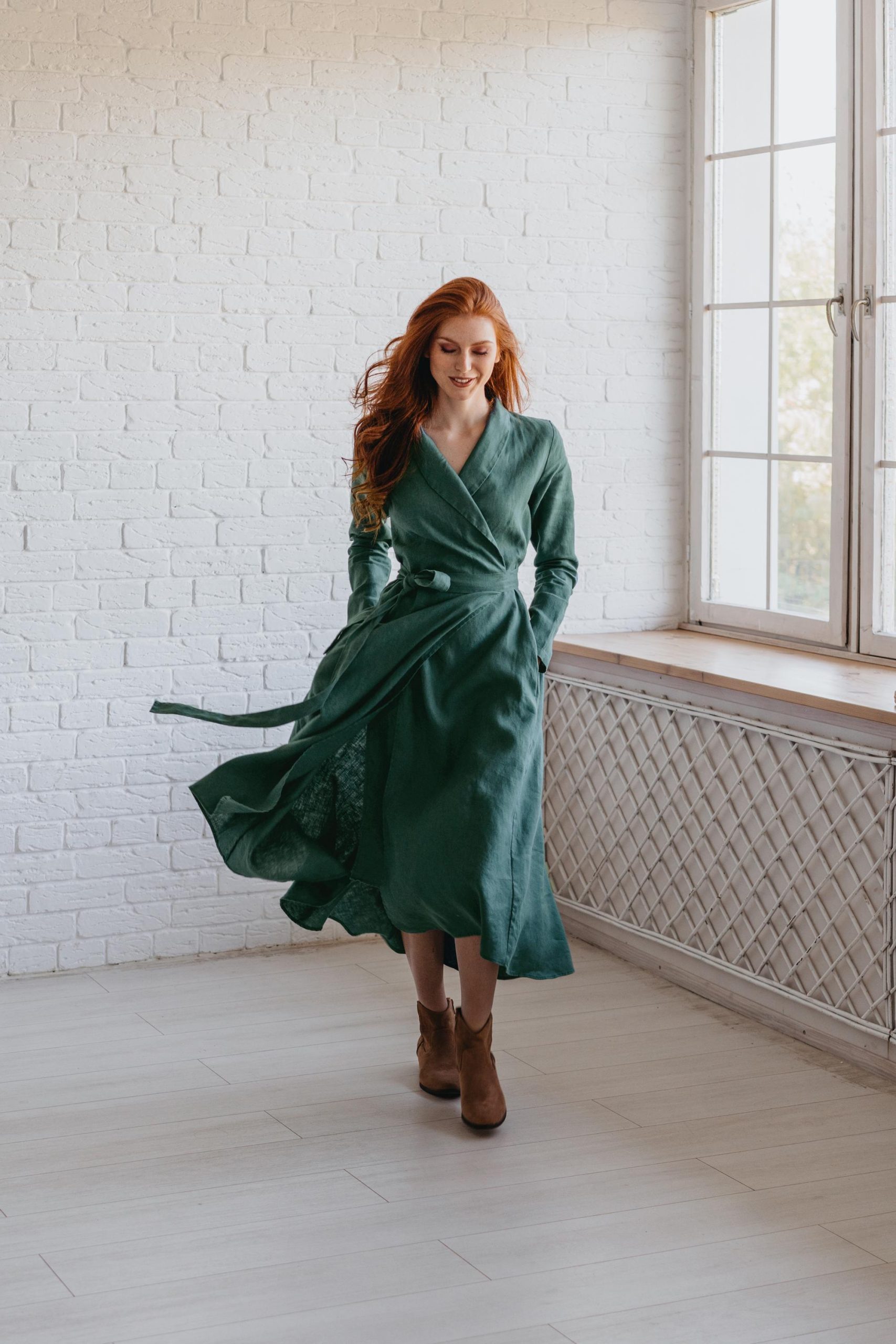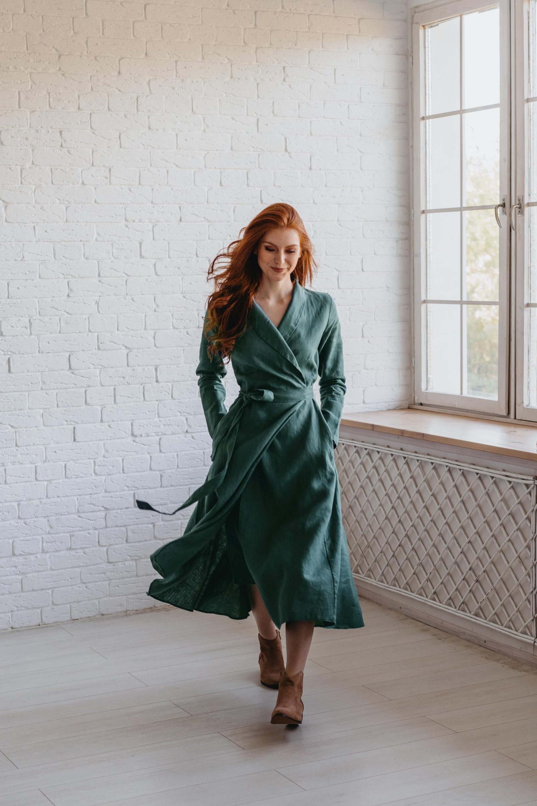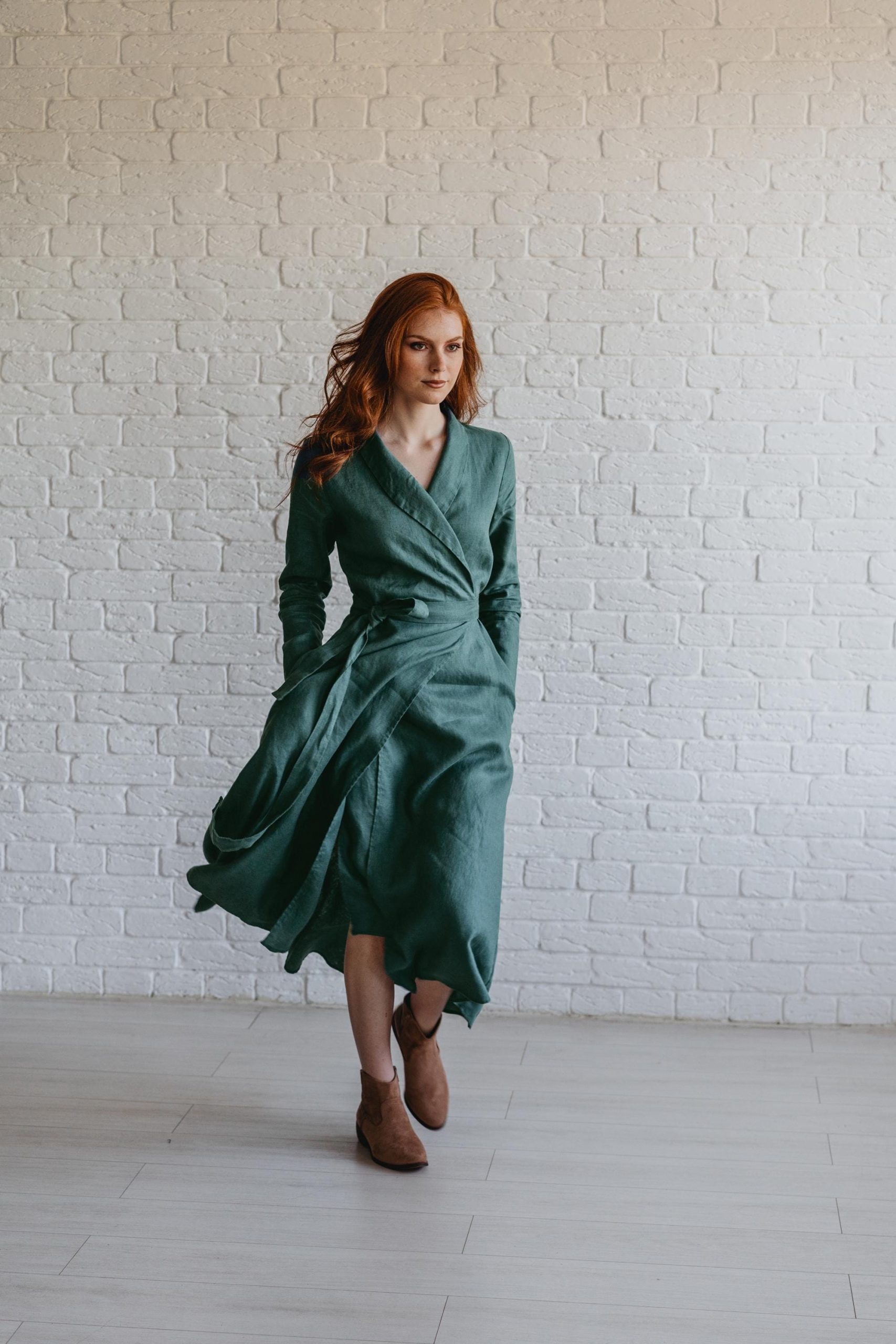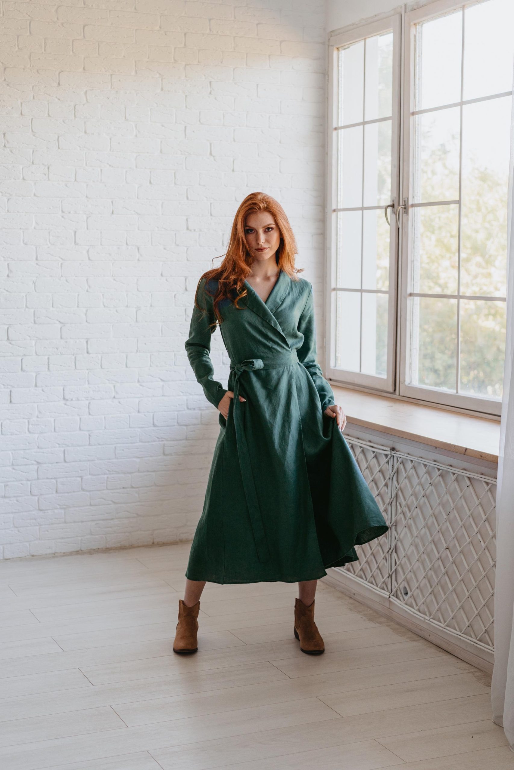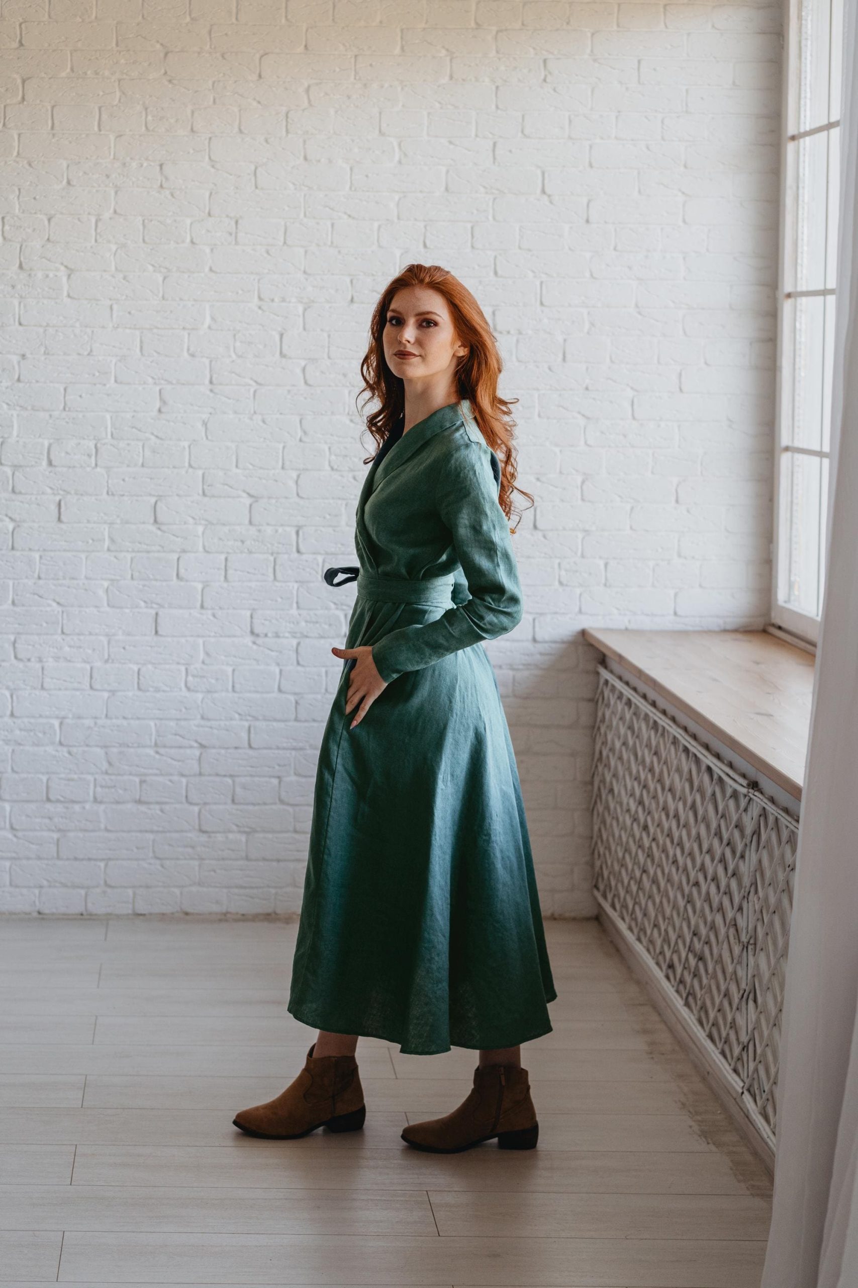 Wrap Heavyweight Linen Dress: Sea Green Midi With